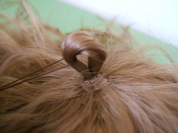 | 裏からつむじの穴に針を通して引っ張ります。 | |