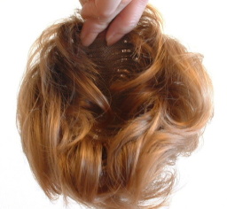 | 右手で前の部分をしっかりもって左手で ウイッグを伸ばしていくようにしてすっぽりと 被せていきます。 その時左手は親指と人差し指はウイッグをもって 後の残りの指で髪をぐいぐいと中に入れていきます。 (う〜ん表現の仕方が難しいです・・・) どちらの手でも被せやすい方で被せてください。 (写真で使っている手で説明しました) |