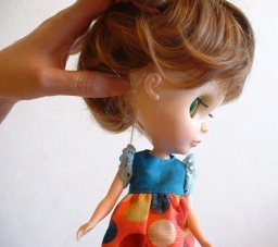 | 私は両手を使ってウイッグを被せれるように ブライスを足に挟んで固定をして被せています。 (ちょっとはずかしい・・・) 髪を後頭部の位置で2つに折ります。 髪の長さによっては3つ折にしたくなる場合がありますが、 二つ折りがおすすめです。 3つ折にしてしまうとどうしても髪に偏りができてしまい ウイッグをかぶせると頭の形がいびつになってしまいます。 また、頭のトップに髪を乗せてしまうと、 宇宙人のように(笑)頭が長くなってしまいますので 気をつけてくださいね♪ |
